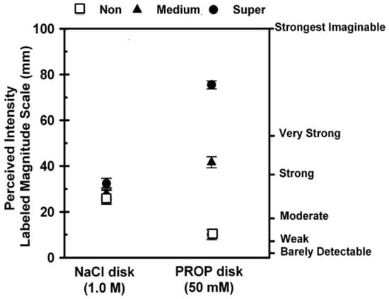 Suprathreshold methods utilize rating scales to assess PROP bitterness across the psychophysical range. Supratheshold scaling can distinguish individuals who are super-tasters from medium tasters, thus classifying individuals as belonging to one of the three PROP taster categories [,,,,,]. Suprathreshold methods are based on ratings of the perceived intensity of PROP following stimulation with multiple samples, a single solution or impregnated filter papers [,,,].