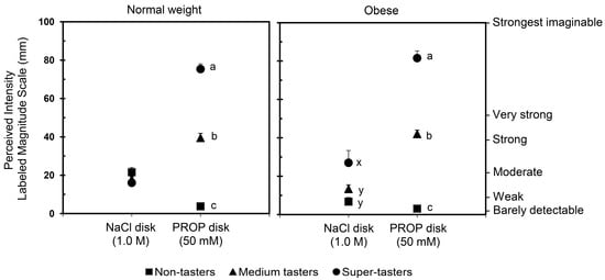 Most studies examining associations between PROP tasting and adiposity have been conducted in mixed subject groups of overweight-obese individuals. Only a few recent studies have been conducted in individuals who meet the criterion for obesity (BMI > 30 kg/m2) [,,]. Presumably, if taste function is altered in obesity, this could impact PROP phenotyping procedures. Two studies described below illustrate this effect. Figure 3 shows typical PROP and NaCl ratings obtained from a group of lean, young women classified by PROP status where NaCl ratings were centered at ~30 mm and did not vary across PROP taster groups.