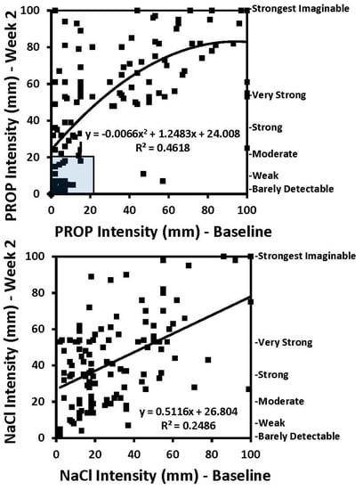 Regression of intensity ratings for 6-n-propylthiouracil (PROP; top panel), and NaCl (bottom panel), at baseline and at two weeks after smoking cessation (controlling for age and gender). Intensity ratings were made using the Labeled Magnitude Scale (0–100 mm). Intensity ratings for both stimuli increased across the trial. PROP intensity ratings have a logarithmic trend line, while NaCl ratings have a linear trend line. Mean intensity ratings for both stimuli rose from baseline to week 2 (for NaCl, 30.2 ± 2.1 vs. 42.3 ± 2.1 and for PROP, 35.9 ± 3.3 vs. 53.2 ± 2.9; p < 0.01 for both). n = 120. The shaded box identifies a small group of participants who were classified as PROP non-tasters at both. Data are from Ahijevych et al. [] with permission.
