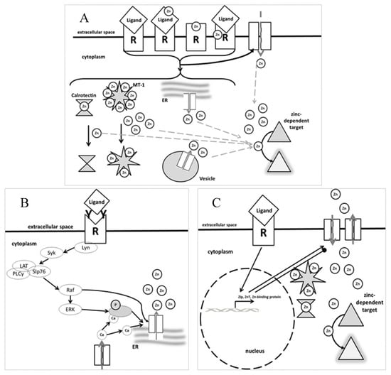 Different Types of Zinc Signals: (A) Zinc Flux, as observed after receptor triggering (e.g., binding of lipopolysaccharide (LPS) to Toll like receptor (TLR)4), is generated within seconds. (B) A Zinc Wave, as is induced via immunoglobulin receptors and involving calcium flux, can be observed within a few minutes. (C) Homeostatic Zinc Signals, for example as observed after LPS stimulation of dendritic cells, take a few hours to be established and involve the expression of zinc transport and binding proteins. For explanations see the text. Abbreviations: ER: endoplasmic reticulum; ERK: extracellular signal-regulated kinase; MT: metallothionein; PLC: phospholipase c; R: receptor; Slp76, SH2 domain-containing leukocyte protein, 76 kD. Modified after [62,96,105].