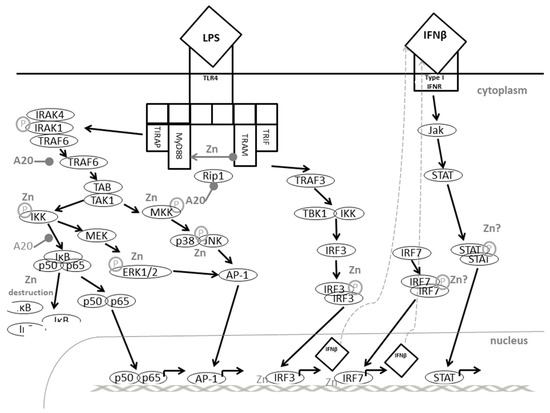 Zinc in Toll like receptor 4-induced signaling. For explanation, see text. Abbreviations: A20: zinc finger protein; AP-1: Activator protein 1; ERK: extracellular Signal-regulated Kinase; IFN: interferon; IRAK: Interleukin-1 receptor-associated kinase; IκB: Inhibitor of NFκB; IKK: IκB kinase; IRF: interferon related factor; JAK: JNK janus kinase; JNK: c-Jun N-terminal Kinase; LPS: Lipopolysaccharide; MAPK: mitogen activated protein kinases MEK: MAPK/Erk kinase; MKK: MAPK kinase; MKP: MAPK phosphatase; MyD88: Myeloid differentiation primary response gene; NFkB: nuclear factor (NF)κB; PI3K: phosphatidyl-inositol-3-phosphate; RIP: receptor interacting protein; STAT: Signal transducers and activators of transcription; TAB: TAK-binding protein; TAK: TGF β-activated kinase; TBK: Tank-binding kinase 1; TIRAP: toll-interleukin 1 receptor (TIR) domain containing adaptor protein; TLR: Toll like receptor; TRAF: TNF receptor-associated factor; TRAM: TRIF-related adaptor molecule; TRIF: Toll-interleukin-1 receptor (TIR) domain-containing adaptor-inducing interferon. Altered from [97,176,178].