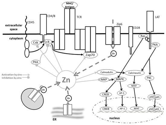 Zinc in TCR-induced signaling. For explanation, see text. Abbreviations: AP-1: Activator protein 1; CREB: cAMP response element-binding protein; Csk: C-terminal Src kinase; ER: endoplasmic reticulum; Lck: lymphocyte-specific protein tyrosine kinase; LAT: linker for activation of T cells; MAPK: mitogen activated protein kinases; MHC: major histocompatibility complex; MKP: MAP kinase phosphatase; NFAT: Nuclear factor of activated T cells; p50/p56: nuclear factor NF-kappa-B subunit p50/p65; PKA: protein kinase A; PKC: protein kinase C; Ras: Rat sarcoma; TCR: T cell receptor; ZAP: z-chain-associated protein kinase; Zip: Zrt-like, Irt-like proteins. Modified after [109,170].