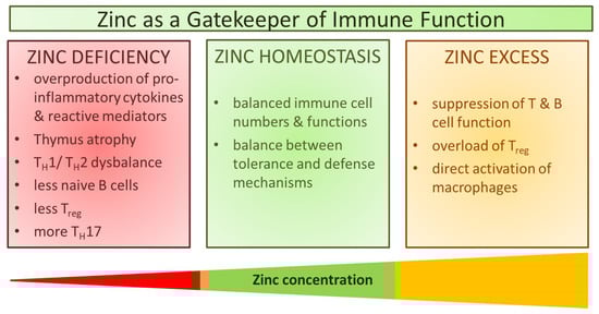 In general, cellular function, such as the intracellular killing of harmful pathogens, cytokine production as well as ROS production, are dependent on zinc and are impaired due to zinc deficiency. Zinc deficiency also adversely affects the maturation and function of T and B cells, which occurs through dysregulation of basic biological functions at the cellular level, described later in this review in more detail. For T cells, a disturbed ratio of Th1 and Th2 cells in favor of Th2-driven allergic reactions is a well-known consequence of zinc deficiency [67]. Zinc flux and homeostatic zinc signals, as defined below, are highly important for adequate T cell differentiation, and this observed malfunction can be reversed by zinc supplementation [68,69,70,71]. Moreover, the pro-tolerogenic immunoreaction is triggered by long-lasting changes in intracellular zinc levels due to induction of regulatory T cells (Treg) cells and dampening of pro-inflammatory Th17 and Th9 cells [72,73,74,75].