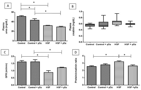 Renal function of animals. (A) plasma urea (mg/dL); (B) plasma creatinin (mg/dL); (C) glomerular filtration rate—GFR (mL/min); and (D) protein/creatinin ratio (proteinuria). Data are expressed as means ± standard deviation. Comparison by two-way ANOVA with Tukey post-hoc. HSF—high sugar fat diet. γOz—Gamma-oryzanol. * statistically different.