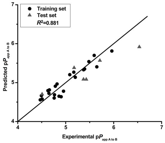 The correlation matrix between pPapp A to B and the respective molecular properties are shown in Table 6. The correlation matrix showed that the properties are independent, demonstrating that the model in this study is robust. Moreover, the QSPR model was validated by cross-validation (leave-one-out) and a high cross-validated coefficient (Q2 = 0.810) was achieved. The pPapp A to B both in training and test set is predicted by this QSPR model with a particularly high degree of accuracy (Figure 1). The predicted deviations of the tested compounds (except 14 and 15) both in training and test set were lower than 0.5 as shown in Table 7. The QSPR is considered of high predictive ability with a high value (0.841) of square of predictive correlation coefficient (R2pred) for the test set. In addition, the low RMSE value (0.242) also confirmed the accuracy of the developed model. These results illustrate that the QSPR model is robust and predictive, and could be used to predict the intestinal absorption of flavonoids.