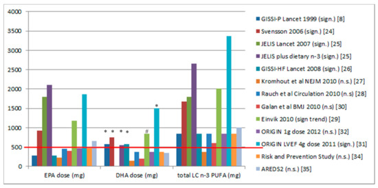 Doses of eicosapentaenoic acid (EPA), docosahexaenoic acid (DHA), and total omega-3 long-chain polyunsaturated fatty acid (n-3 LCPUFA) from randomised controlled trials on n-3 LCPUFA supplementation and clinical cardiovascular disease (CVD) outcomes. The red line shows that a DHA dose of 500 mg or greater results in significant CVD outcomes. * Significant effects (p < 0.05); # only 140 per group showing a trend towards a significant effect (p = 0.063). Sign means significant and n.s. means not significant.