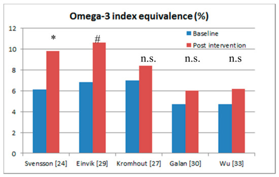 The studies by Galan et al. [30] and Wu et al. [33] showed no significant cardiovascular benefits after omega-3 supplementation, but these studies failed to reach omega-3 fatty acid status levels that are associated with cardioprotection (i.e., between 8% and 11%) [38].