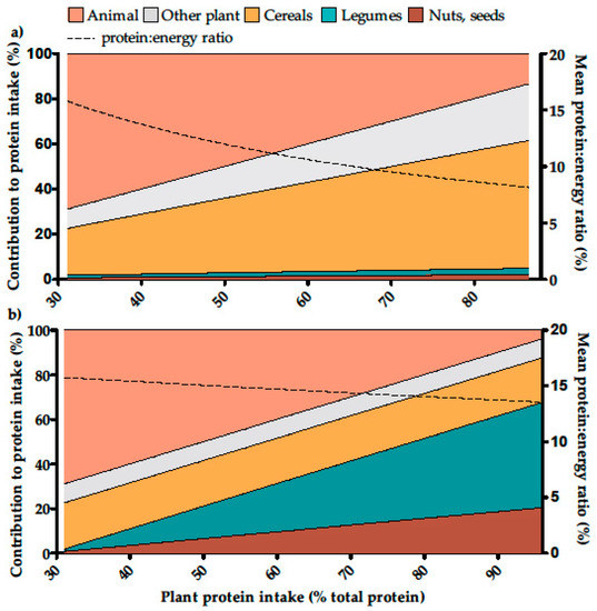 - Additionally, intermediate models combining model A and model B were designed. In these models, animal protein was replaced with the same amount of energy (without alcohol) from both plant foods already consumed and the mix of legumes, nuts and seeds in various proportions. The proportions of the mix of legumes, nuts and seeds in the substituting combination were 0% (i.e., same as Model A), 20% (model C20), 40% (model C40), 60% (model C60), 80% (model C80) and 100% (i.e., same as Model B).
