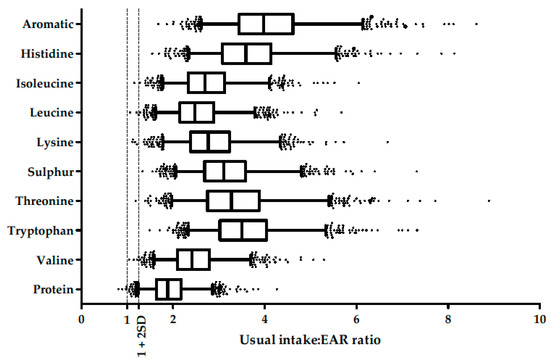 Usual intake:EAR ratio distribution of protein and amino acids in the French adult population (INCA2 study). Distribution of usual intakes of protein and IAA are represented using boxplots with median, 25th and 75th percentiles and whiskers drawn left to the 2.5th and right to the 97.5th percentiles. Points are individuals outside the 2.5th–97.5th percentile range. If the ratio between the usual intake and EAR of an individual was equal to 1, the probability of an adequate intake was 50% and if the ratio was 1 + 2SD, the probability of an adequate intake was 97.5%. The prevalence of inadequacy in the population was lower than 0.05% for all IAA and 0.31% for protein. EAR, Estimated average requirement; INCA2, Individual and National Consumption Survey 2 (n = 1678).