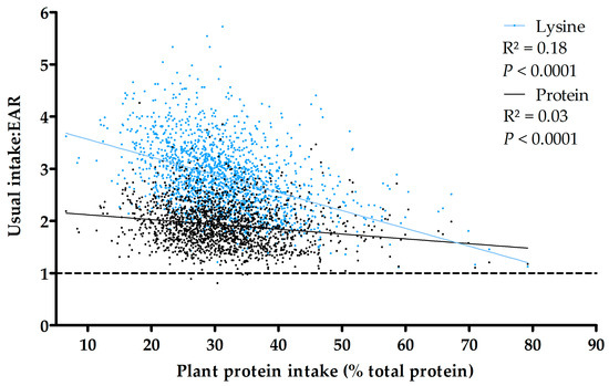 Association between protein and lysine intakes: EAR ratios and plant protein intake (% of total protein) in the diets. Points represent individuals of the French adult population (INCA2 study, n = 1678). The slopes of the linear regressions were significantly (p < 0.001) different from 0.