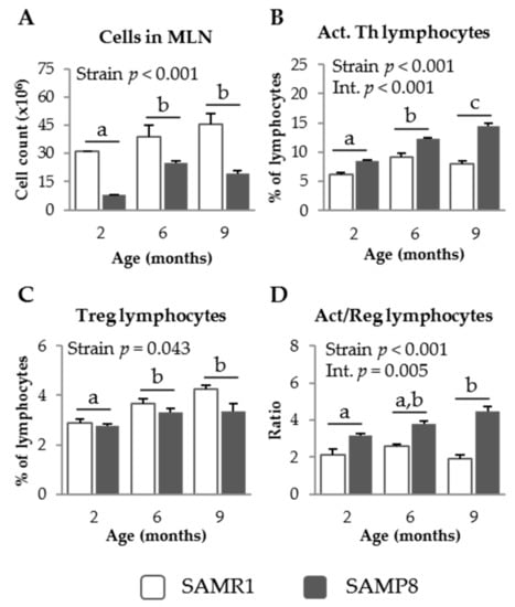 Cell recruitment (A); percentage of activated (Act.) Th lymphocytes (B); percentage of regulatory (Treg) Th lymphocytes (C); and the ratio of activated to regulatory Th lymphocytes (D), in mesenteric lymph nodes (MLN) of SAMR1 and SAMP8 mice at 2, 6, and 9 months of age. The open bars represent SAMR1 mice; the solid bars, SAMP8 mice. Results are expressed as means ± SEM (n = 5–11 animals). Means without a common letter differ, p < 0.05. Int., interaction between factors (age and mice strain).