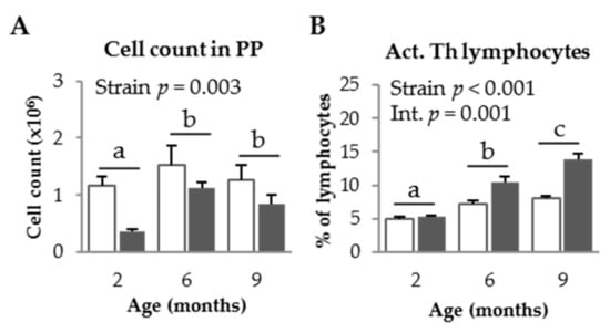 As for MLN, the PP cell count was higher in SAMR1 mice than in SAMP8 mice (p = 0.003, Figure 2A), and increased with age in both mice strains (p = 0.047). The percentage of activated Th lymphocytes was higher in SAMP8 mice than in SAMR1 mice (p < 0.001, Figure 2B) and also increased with age (p < 0.001). Moreover, the effect of age was more pronounced in SAMP8 mice than in SAMR1 mice (p = 0.001). The percentage of regulatory Th lymphocytes decreased in mice from both strains at 9 months of age (p < 0.001; Figure 2C). The ratio of activated to regulatory Th lymphocytes increased with age (p < 0.001, Figure 2D).