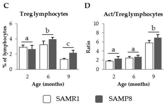 Elderly people have a decreased capacity to generate adequate adaptive responses, making them more susceptible to systemic infections and side effects of medication [25]. Aging is characterized by a loss of the responsiveness of T cells [16] and altered function of Treg lymphocytes which makes them less efficient at inhibiting the pro-inflammatory activities of other cell types [26,27]. Thus, Treg lymphocytes from aged individuals are less efficient at preventing inflammaging, although their numbers increase with age in lymphoid tissues. Several studies in mice have demonstrated a greater presence of Treg lymphocytes in the lymphoid organs of old animals than those of young animals, while the number in circulating blood remains unchanged [26,28]. Our results demonstrate that this phenomenon also occurs in the MLN of SAMP8 and SAMR1 mice.