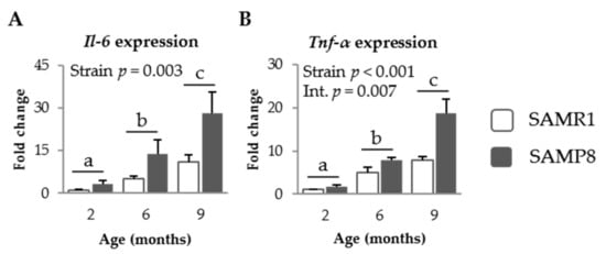 mRNA expression of Il-6 (A) and Tnf-α (B), in the jejunum mucosa of SAMR1 and SAMP8 mice at 2, 6, and 9 months of age. The open bars represent SAMR1 mice; the solid bars, SAMP8 mice. All the target genes were normalized to glucuronidase β (Gusβ) expression. The fold change expression is related to SAMR1 mice of 2 months of age. Results are expressed as means ± SEM (n = 6–7 animals). Means without a common letter differ, p < 0.05. Int., interaction between factors (age and mice strain).