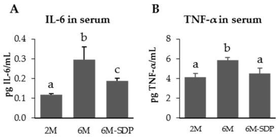 Serum concentration of IL-6 (A) and TNF-α (B) of SAMP8 mice of the 2-month-old (2M), 6-month-old (6M), and 6-month-old fed spray-dried plasma (6M-SDP) groups. Results are expressed as means ± SEM (n = 6–7 animals). Means without a common letter differ, p < 0.05.