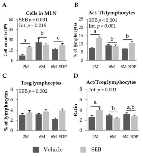 Cell recruitment (A); percentage of activated (Act.) Th lymphocytes (B); percentage of regulatory (Treg) Th lymphocytes (C); and the ratio of activated to regulatory Th lymphocytes (D), in mesenteric lymph nodes (MLN) of SAMP8 mice of the 2-month-old (2M), 6-month-old (6M), and 6-month-old fed spray-dried plasma (6M-SDP). The dark grey bars represent groups that received the vehicle and the light grey bars represent mice administered with S. aureus enterotoxin B (SEB). Results are expressed as means ± SEM (n = 5–8 animals). Means without a common letter differ, p < 0.05. Int., interaction between factors (SEB administration and experimental groups; 2M, 6M, and 6M-SDP).