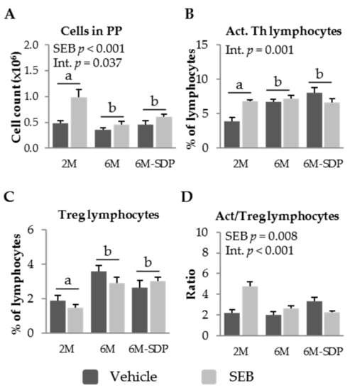 Cell recruitment (A); percentage of activated (Act.) Th lymphocytes (B); percentage of regulatory (Treg) Th lymphocytes (C); and the ratio of activated to regulatory Th lymphocytes (D), in Peyer’s patches (PP) of SAMP8 mice of the 2-month-old (2M), 6-month-old (6M), and 6-month-old fed spray-dried plasma (6M-SDP). The dark grey bars represent groups that received the vehicle and the light grey bars represent mice administered with S. aureus enterotoxin B (SEB). Results are expressed as means ± SEM (n = 6–8 animals). Means without a common letter differ, p < 0.05. Int., interaction between factors (SEB administration and experimental groups; 2M, 6M, and 6M-SDP).