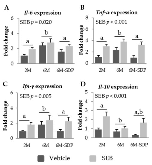 mRNA expression of Il-6 (A), Tnf-α (B), Ifn-γ (C), and Il-10 (D) in the jejunum mucosa of SAMP8 mice of the 2-month-old (2M), 6-month-old (6M), and 6-month-old fed spray-dried plasma (6M-SDP). The dark grey bars represent groups that received the vehicle and the light grey bars represent mice administered with S. aureus enterotoxin B (SEB). All the target genes were normalized to glucuronidase β (Gusβ) expression. The fold change expression is related to 2M mice administered with vehicle. Results are expressed as means ± SEM (n = 5–6 animals). Means without a common letter differ, p < 0.05. Int., interaction between factors (SEB administration and experimental groups; 2M, 6M, and 6M-SDP).