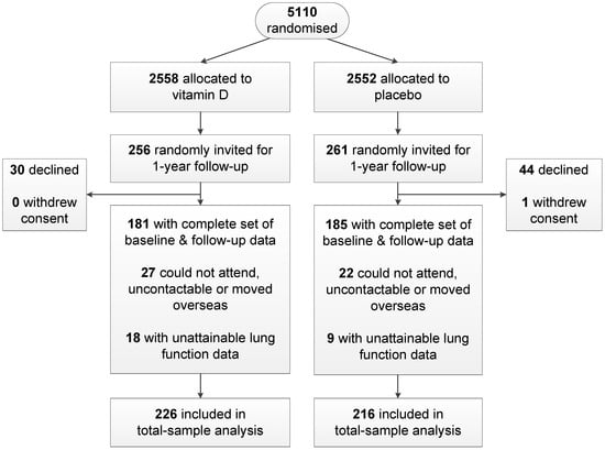 The study flowchart is shown in Figure 1. From the 5110 participants randomized in the main ViDA study, 517 (10%) were randomly selected and invited to partake in the current sub-study. Of these, 74 declined and 1 withdrew consent (data analysis prohibited), and were thus not included in subsequent analyses. Out of the remaining 442, a complete set of both baseline and 1-year follow-up measurements was available in 366 participants (83%). The 76 participants with missing data comprised 49 who did not attend the follow-up interview (could not attend, uncontactable or moved overseas) and 27 who had unobtainable spirometry data (could not obtain a reading). Per intention-to-treat, all 442 people were included in the total-sample analysis. The proportion of the total sample with missing follow-up data did not differ across the two treatment groups (p = 0.96, χ2 test). Further, baseline lung function of those with missing follow-up data did not differ from those without missing follow-up data (p-values ranging from 0.47 to 0.57; analysis of variance.)