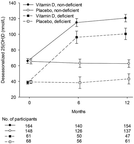 Blood samples were collected at baseline, and at 6 and 12 months of follow-up to measure calcium for hypercalcemia (corrected calcium > 10.4 mg/dL). Remaining plasma aliquots were stored frozen at −80 °C. Serum 25(OH)D (combining D2 and D3) concentration was measured in these aliquots (baseline and follow-up samples were measured in the same batch for each participant) by liquid chromatography-tandem mass spectrometry (ABSciex API 4000, Framingham, MA, USA) at a laboratory participating in the Vitamin D External Quality Assessment Scheme (DEQAS) program (www.deqas.org).