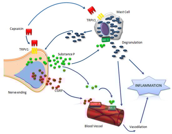 Applied on the skin or oral mucosa, capsaicin induces initially a local burning sensation [26], followed by allodynia and hyperesthesia to mechanical and heat stimulation [33]. These nociceptive effects are associated with a transient local wheal and flare response known as neurogenic inflammation, triggered by the release of neuropeptides from the cutaneous sensory nerve endings (see Figure 1) [34,35]. Substance P (SP) and calcitonin-gene related peptide (CGRP) are recognized as the most important neuropeptides within neurogenic inflammation [36]. SP acts upon micro vascularization through its neurokinin-1 receptor (NK-1R) and has vasodilatory effects, increases vascular permeability and favors the release of pro-inflammatory cytokines [37], whilst CGRP induces microvascular dilatation resulting in increased blood flow [38]. Besides the neuropeptides release from nerve fibers, activation of mast cells has an important role in the capsaicin-induced inflammatory reaction [39]. Neuropeptides, with SP having the most significant effects, induce mast cell degranulation and synthesis of pro-inflammatory cytokines [40,41]. Mast cell mediators in turn activate nociceptors and further amplify the release of neuropeptides from the sensory nerves [39].