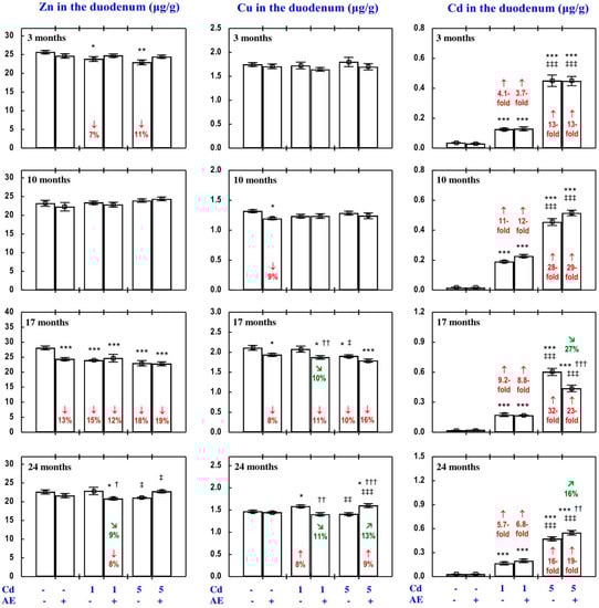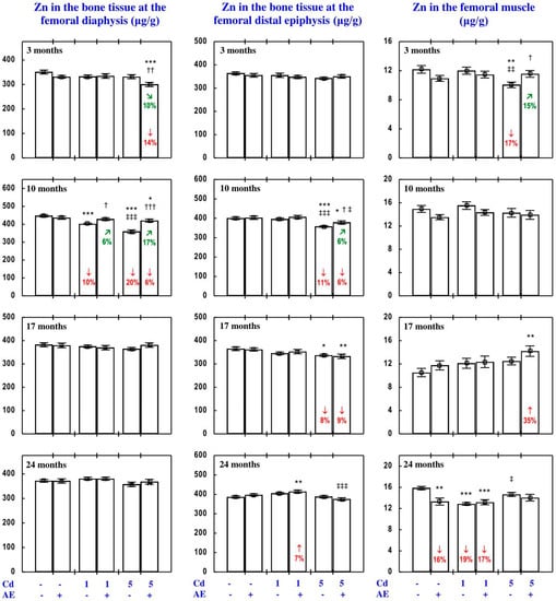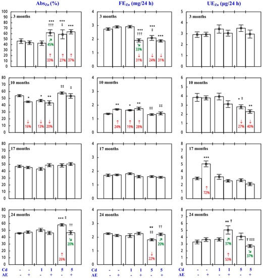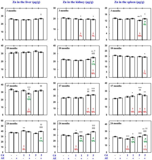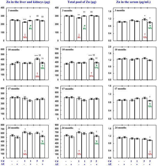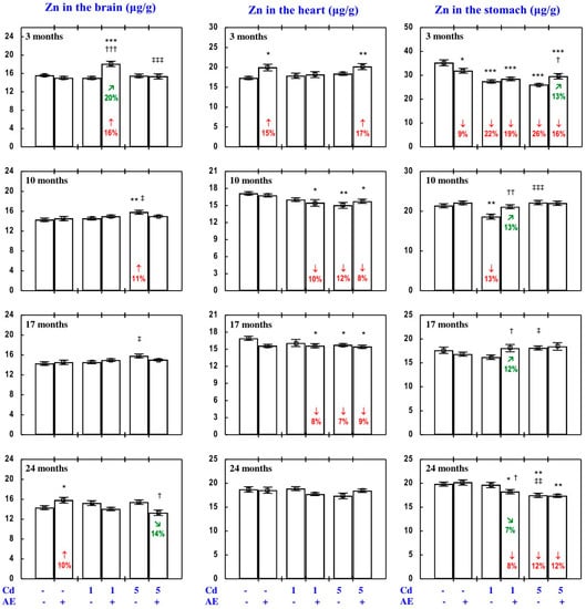 3.2. Effect of AE on the Body Status of Zn under Exposure to Cd