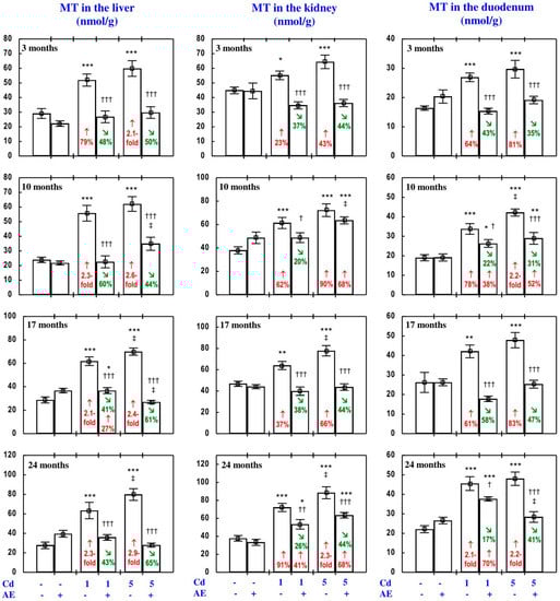 3.4. Effect of AE on MT Concentration in the Liver, Kidney, and Duodenum, and the Degree of Zn, Cu, and Cd Binding to This Protein