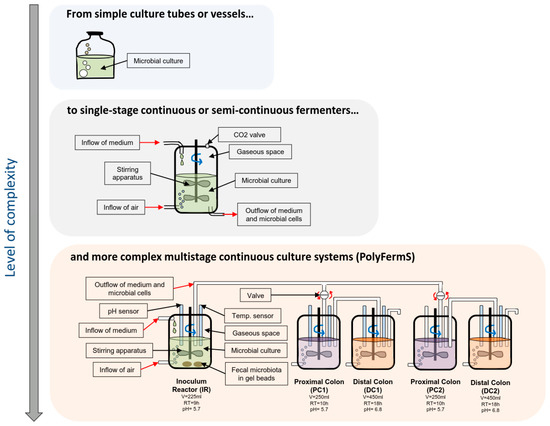- Fehlbaum, S.; Chassard, C.; Haug, M.C.; Fourmestraux, C.; Derrien, M.; Lacroix, C. Design and Investigation of PolyFermS In Vitro Continuous Fermentation Models Inoculated with Immobilized Fecal Microbiota Mimicking the Elderly Colon. PLoS ONE 2015, 10, e0142793. [Google Scholar] [CrossRef] [PubMed]