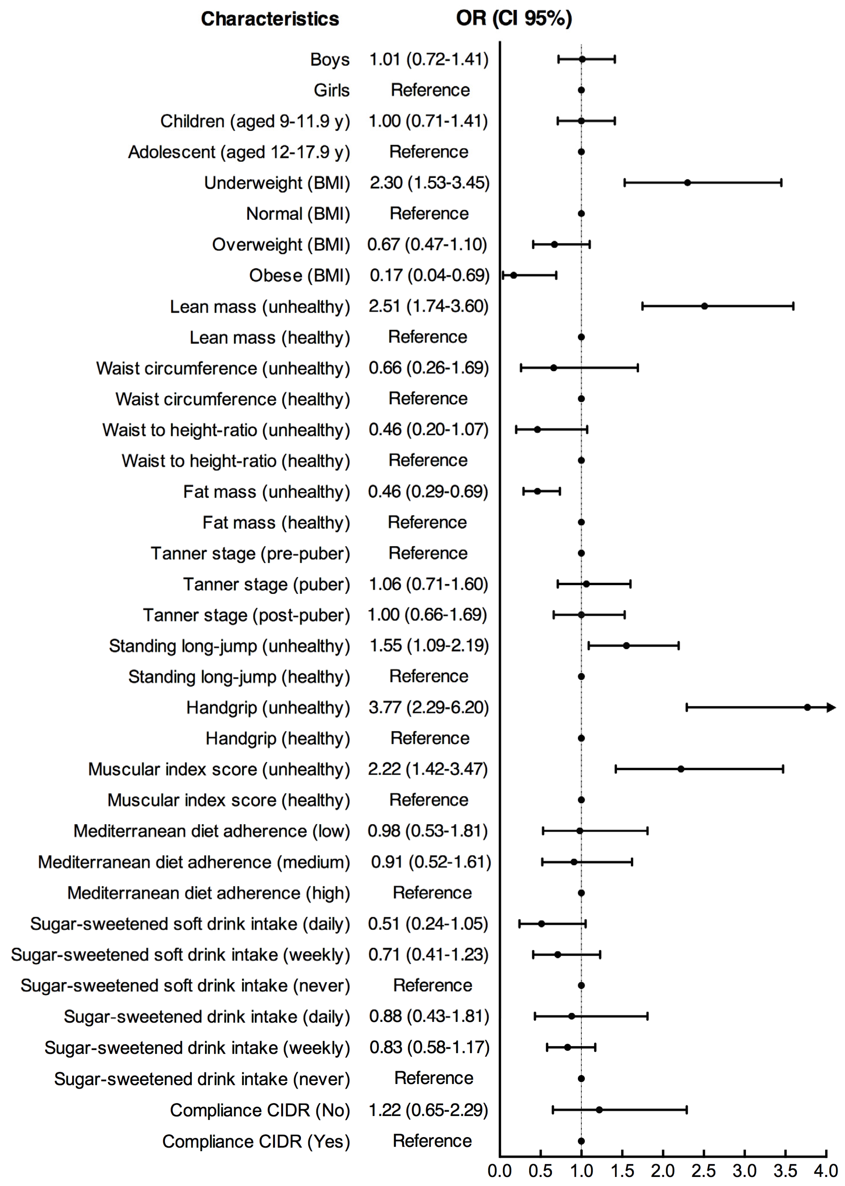 | Standing long-jump (unhealthy) | 526 | 55.0 | 52.0 | 57.9 | 106 | 65.4 | 58.6 | 72.2 | 0.014 |