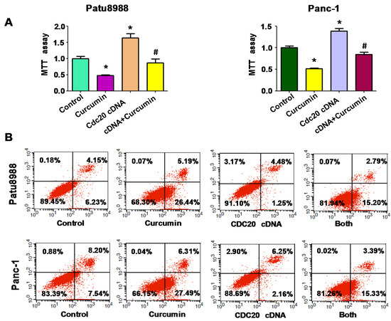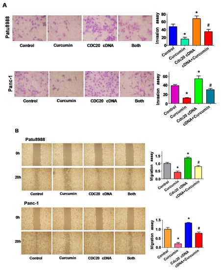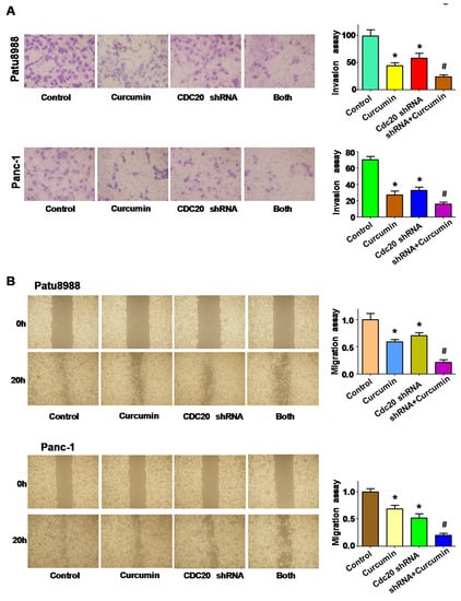 The effect of Cdc20 downregulation on cell migration, and invasion. (A) Invasion assay was conducted in PC cells after Cdc20 shRNA transfection and curcumin treatment; (B) The wound healing assay was used to measure the cell migration in PC cells after Cdc20 shRNA transfection and curcumin treatment. Both: curcumin + Cdc20 shRNA. * p < 0.05, vs. control; # p < 0.05 vs. curcumin treatment or Cdc20 shRNA transfection.