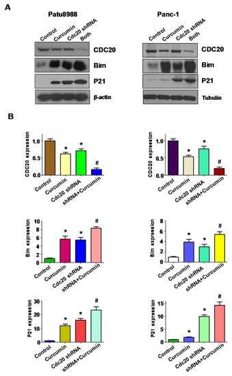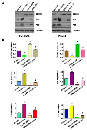 The expression of Cdc20, Bim and p21 was measured in PC cells. (A) The expression of Cdc20 and its targets Bim and p21 was measured by western blotting in PC cells with Cdc20 cDNA transfection and curcumin treatment (15 μM curcumin for patu8988 and 20 μM curcumin for Panc-1); (B) Right panel: Quantitative results are illustrated for left panel. * p < 0.05, compared with control; # p < 0.05 compared with curcumin treatment or Cdc20 cDNA transfection.