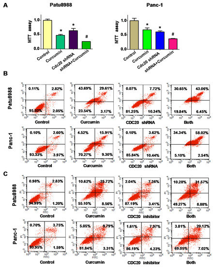 The effect of Cdc20 downregulation on cell growth and apoptosis. (A) MTT assay was conducted to determine the effect of Cdc20 shRNA in combination with curcumin treatment on PC cell growth. * p < 0.05, compared with control; # p < 0.05 compared with curcumin treatment or Cdc20 shRNA transfection; (B) Apoptosis was detected by flow cytometry in PC cells with Cdc20 shRNA transfection and curcumin treatment. Both: curcumin + Cdc20 shRNA. C. Apoptosis was analyzed by flow cytometry in PC cells with Cdc20 inhibitor (50 μM Apcin) and curcumin treatment. Both: curcumin + Cdc20 inhibitor. PI: propidium iodide; FITC: fluorescein isothiocyanate.
