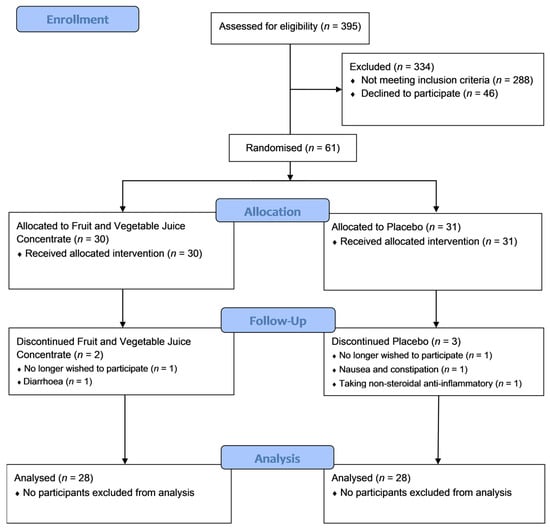 Patient flow consolidated standards of reporting trials (CONSORT) diagram. A total of 395 patients were screened for eligibility to participate; 61 of those who were eligible and wished to participate were randomised to either the fruit and vegetable juice concentrate intervention group or placebo, each taking three capsules twice daily.