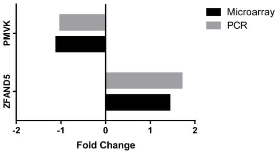Validation of microarray analysis; fold changes in gene expression following the intervention as determined by microarray versus quantitative polymerase chain reaction (qPCR). Zinc finger, AN1-type domain 5 (ZFAND5); Phosphomevalonate kinase (PMVK).