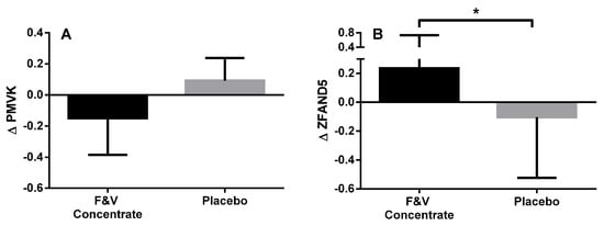 Change in peripheral blood mRNA expression of PMVK (A) and ZFAND5 (B) at baseline compared to Week 8 in the fruit and vegetable juice concentrate (F&V concentrate) and placebo groups; measured using qPCR; the data presented are the median (IQR); the statistical test used was the Mann–Whitney test; * p < 0.05 versus baseline.