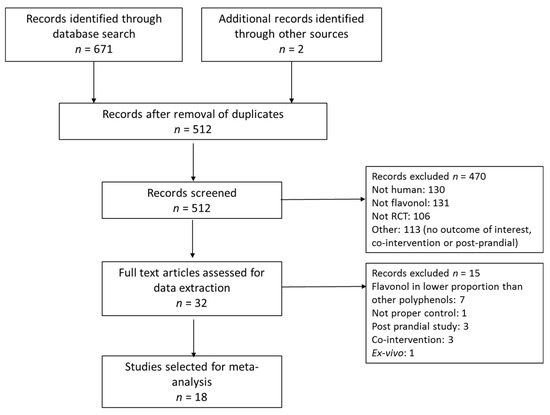 A total of 671 studies were retrieved from database search and two others from additional sources. After screening and application of exclusion criteria, 32 trials were selected for data extraction. Fifteen of these studies were rejected after detailed analysis of the full text. Many of the rejected studies in this phase were studies where the test food had a significant content in flavonols but was richer in other flavonoids or phenolic acids (for example, apple, cocoa and tea have a higher content of flavanols than flavonols; grape and berries have a higher content of anthocyanins or phenolic acids and, thus, the observed results in the outcomes cannot be imputed to the flavonols, which is the objective of this meta-analysis). Finally, 18 RCTs were included in the systematic review and meta-analysis. The study selection process is shown in Figure 1.