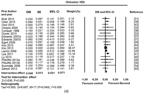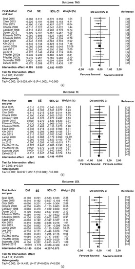 Chronic supplementation with flavonols, with quercetin as the main flavonol used in the interventions, was associated with a beneficial effect on blood lipid levels (Figure 2). Fixed-effect meta-analyses showed a significant reduction in TAGs levels (DM = −0.10 mmol/L; CI: −0.18, −0.03; p = 0.007; 17 studies, 467 supplemented participants and 456 control participants, Figure 2a), TC (DM = −0.11 mmol/L; CI: −0.20, −0.02; p = 0.021; 18 studies, 473 supplemented participants and 462 control participants; Figure 2b) and LDL (DM = −0.14 mmol/L; CI: −0.21, −0.07; p = 0.000; 18 studies, 473 supplemented participants and 462 control participants; Figure 2c). A significant increase was observed in HDL (DM = 0.05 mmol/L; CI: 0.02, 0.07; p = 0.000; 18 studies, 473 supplemented participants and 462 control participants; Figure 2d). There was no suggestion of heterogeneity among studies (I2 = 0% and p value for Q test > 0.1). Funnel plots and Egger’s weighted regression statistic did not suggest evidence of publication bias for TC (p = 0.089), HDL (p = 0.461), and LDL (p = 0.494). However, asymmetry was detected for TAG (p = 0.048) (Supplementary Materials Figure S1).