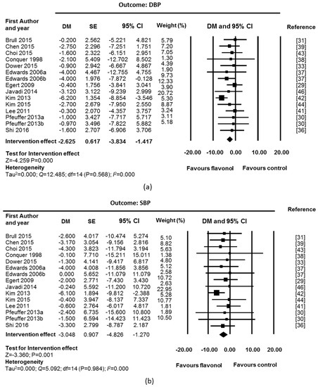 Effect of flavonol supplementation on measures of blood pressure (mmHg): (a) Dyastolic blood pressure (DBP); and (b) Systolic blood pressure (SBP). All studies were used for fixed effect model meta-analysis. The Edwards study consisted of two substudies: hypertensive participants (Edwards 2007a) and pre-hypertensive participants (Edwards 2007b). The Pfeuffer study also consisted of two substudies: polymorphism ApoE3 (Pfeuffer 2013a) and ApoE4 (Pfeuffer 2013b).