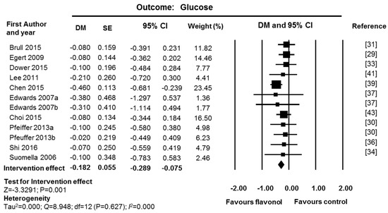 Fixed-effect meta-analysis of glucose data showed a significant reduction in fasting glucose levels after supplementation with flavonols (DM = −0.18 mmol/L; CI: −0.29, −0.08; p = 0.001; 12 studies, 276 supplemented participants and 270 control participants; Figure 4). No heterogeneity was found (I2 = 0% and p value for Q test > 0.1). Sensitivity analysis was performed by removing one study with high risk of bias [41] and one industry funded study [33]. The intervention effect and the significance level were maintained (DM = −0.19 mmol/L; CI: −0.30, −0.07, p = 0.001; 10 studies, 209 supplemented participants and 205 control participants). Analysis of funnel plots and Egger’s statistics (Supplementary Materials Figure S1) showed no evidence of publication bias for glucose (p = 0.441).