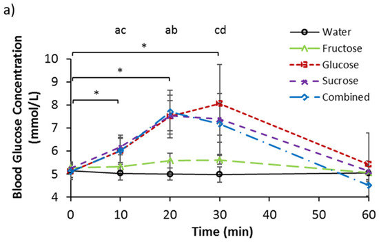 Whilst the participants were asked to record their food intake and physical activity in the 24 h prior to their first experimental trial, for the purpose of standardisation by repeating these in subsequent trials, no dietary information was collected on the habitual consumption of sugar-sweetened beverages. Long periods of high fructose intake at 25% of the energy requirements can alter glucose and insulin responses within ten weeks, and markers of lipid metabolism within two weeks [13,14]. However, during the relatively short period of study, it would have been unlikely that any participants had such a large change in their habitual diet in the present study. Furthermore, as it was a repeated measures design, each participant acted as their own control so this would not affect the conclusions made. A limitation of the current study is the generalisability of these novel results on the effect of ingestion of simple sugars in amounts reflective of typical consumption, as only healthy men were studied in the present study. Hormonal and metabolic responses to simple sugar ingestion in women may differ, and future research in this area should explore whether there are any sex differences, in addition to the responses of those who are obese or who have other metabolic disorders.