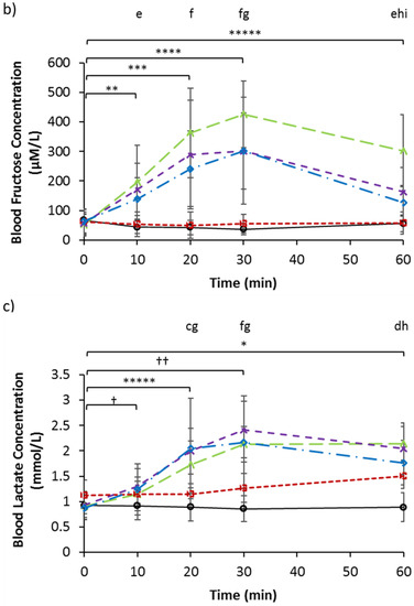 Serum (a) glucose (b) fructose and (c) lactate concentrations at baseline and following ingestion of 595 mL of water (W), 6% fructose (F), 6% glucose (G), 6% sucrose (S) and 6% combined glucose and fructose (C) solutions. a G, S, and C are greater than W; b G, S, and C are greater than F; c S is greater than F; d All carbohydrate trials are greater than W; e S is greater than G; f F is greater than W and G; g S is greater than W and G; h F is greater than G; I F is greater than C; * Increase from baseline for G, S, and C; ** Decrease from baseline for W; *** Increase from baseline for F; **** Decrease from baseline for W, and increase for F and S; ***** Increase from baseline for F and S; † Increase from baseline for S; †† Increase from baseline for S and C. All p < 0.05. Values are mean ± standard deviation.