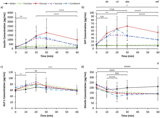Serum (a) Insulin (b) glucose dependent insulinotropic polypeptide (GIP) (c) glucagon like peptide-1 (GLP-1) and (d) ghrelin concentrations at baseline and following ingestion of 595 mL of water (W), 6% fructose (F), 6% glucose (G), 6% sucrose (S) and 6% combined glucose and fructose (C) solutions. a W is less than G, S, and C; b Fructose is less than G, S, and C; c W is less than G and S; d F is less than G and S; e S is less than G; f C is less than G; g W is greater than F; * Increase from baseline for G; ** Increase from baseline for G and S; *** Decrease from time-point for G, S, and C; **** Decrease from time-point for G; ***** Decrease from time-point for S; † Increase from baseline for C; †† Decrease from time-point for C; ††† Decrease from time-point for C and S; †††† Decrease from baseline for S and C; ††††† Decrease from baseline for F and S. All p < 0.05. Values are mean ± standard deviation.