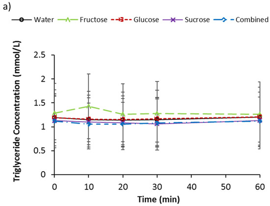 Baseline serum triglyceride concentrations (Table 2) were not different between trials (p = 0.673). An interaction effect (p = 0.032) was indicated for serum triglyceride concentration (Figure 3a). No main effects of trial (p = 0.425) or time (p = 0.254) were present. A difference at 10 min between trials tended to significance (p = 0.099). Differences over time tended to significance for G (p = 0.053), S (p = 0.092), and C (p = 0.073). A difference over time was indicated for W (p = 0.039), but no pairwise differences were located, and no change over time was seen for F (p = 0.279). Incremental AUC values were −1.81 ± 3.00, −0.65 ± 1.74, 0.54 ± 5.56, −1.97 ± 1.75, and −2.09 ± 3.56 mmol/L 1 h, for W, G, F, S, and C, respectively. No differences were present for iAUC (p = 0.534).