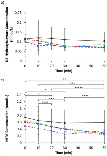 Serum (a) triglycerides (b) d-3 hydroxybutyrate and (c) non esterified fatty acids (NEFA) concentrations at baseline and following ingestion of 595 mL of water (W), 6% fructose (F), 6% glucose (G), 6% sucrose (S) and 6% combined glucose and fructose (C) solutions. * Decrease from baseline for W, G, and C; ** Decrease from baseline for G and C; *** Decrease from 10 min for G and C; **** Decrease from time-point for G; ***** Decrease from time-point for C. All p < 0.05. Values are mean ± standard deviation.