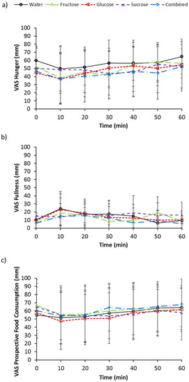 Visual analogue scale (VAS) scores for (a) hunger (b) fullness and (c) prospective food consumption at baseline and following ingestion of 595 mL of water (W), 6% fructose (F), 6% glucose (G), 6% sucrose (S) and 6% combined glucose and fructose (C) solutions. Values are mean ± standard deviation.