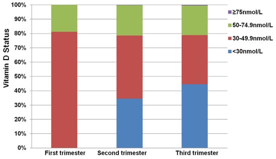 Vitamin D status among pregnant women in the first, the second and the third trimester. First trimester, 1–12 weeks of gestation (n = 38); second trimester, 13–28 weeks of gestation (n = 12,000); third trimester, 29–40 weeks of gestation (n = 1768). The vitamin D status was indicated as the mean value of the serum 25-hydroxyvitamin D (25(OH)D) level (<30 nmol/L; 30–49.9 nmol/L; 50–74.9 nmol/L and ≥75 nmol/L).