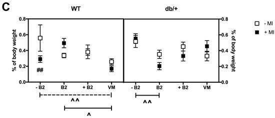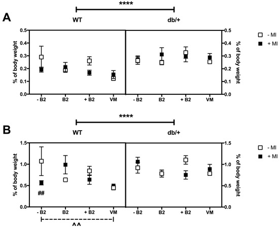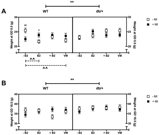 (A) Body weight at GD0.5 (g). * indicates a main effect; # indicates a difference between groups with and without MI.; and ^ indicates a difference between vitamin status groups, where a dashed line indicates the difference occurs in the group without MI, and a solid line indicates that the difference occurs in the group with MI. There was a significant difference between WT and db/+ overall—indicated by ** (p = 0.017). There was also a significant difference between WT mice with and without MI in the –B2 (p = 0.008) and B2 (p = 0.015) groups—indicated by #. In addition, there was a significant difference between WT mice with suboptimal and normal B2 in the absence of MI (indicated by ^^ (p = 0.001)), and between WT with suboptimal and vitamin mix in the absence of MI (indicated by ^^ (p = 0.011)); (B) Body weight at GD18.5 (g). There was a significant difference between WT and db/+ overall—indicated by ** (p = 0.004). n = 7–12 mice per group.