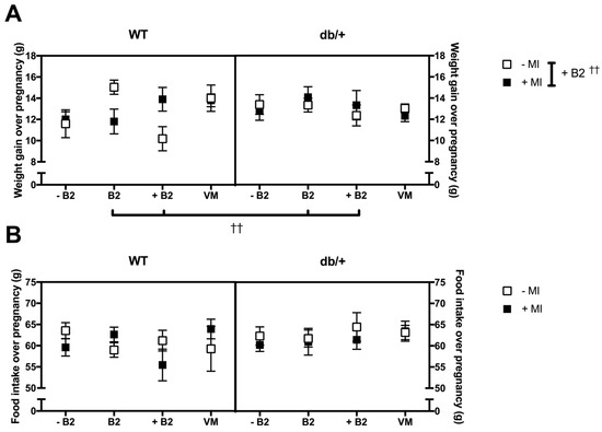 (A) Weight gain over pregnancy (g). † indicates a simple main effect. There was a significant difference between mice on normal B2 and supplemented B2, in the absence of MI, as indicated by †† under the graph. There was a significant difference between mice with and without MI in the presence of supplemented B2, as indicated by †† on the right of the key (p = 0.015); (B) Food intake over pregnancy (g). There was no effect of genotype, MI, or vitamin status on food intake over pregnancy; (C) Litter size at GD18.5. Mice supplemented with B2 had significantly fewer foetuses per litter than mice in the normal B2 and vitamin mix groups, as indicated by †† under the graph. Mice supplemented with MI had more foetuses per litter than mice not receiving MI in the supplemented B2 group, as indicated by †† on the right of the key (p = 0.016). These differences generally match the differences seen in weight gain (Figure 2A), indicating that litter size was the primary driver of weight gain over pregnancy. n = 7–12 mice per group.