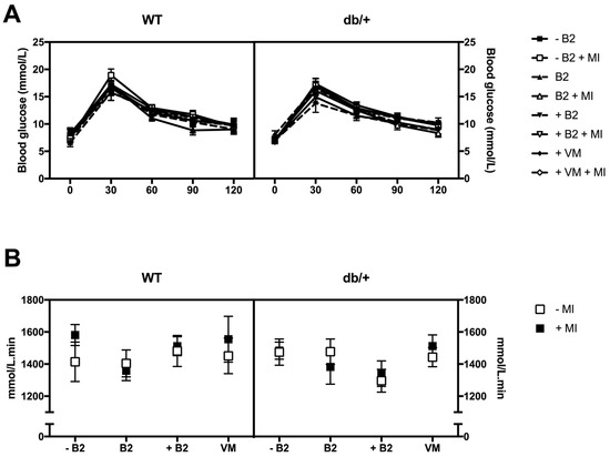There was a three-way interaction between genotype, MI, and B2 (p = 0.005), as a result of a simple two-way interaction between MI and B2, in db/+ mice (p = 0.0001).