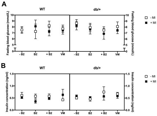 All statistical analysis was performed by IBM SPSS (Armonk, NY, USA). Graphs were produced using GraphPad Prism. Statistical tests were designed to compare the effects of genotype (WT vs. db/+), the effects of MI status (no added MI vs. added MI), and the effects of vitamin status (suboptimal B2, normal B2, supplemented B2, and vitamin mix) via three-way ANOVA. To check if the data were normally distributed, the Shapiro–Wilk’s test of normality was performed. Levene’s test for equality of variances was used in order to test homogeneity of variances. In the case of failure of one or both of these tests, data were appropriately transformed to achieve normal distribution. If the same results were obtained with unadjusted and transformed data, the unadjusted data were used. Data were first assessed for a three-way interaction. Where a three-way interaction was present, this was followed by testing for a simple two-way interaction within both WT and db/+ mice, and then further determining simple-simple main effects and simple-simple comparisons. If a three-way interaction was not present, it was established whether any significant two-way interaction existed. If a two-way interaction existed, the simple main effect and simple comparisons of the independent variable of interest was assessed. If neither a two-way nor three-way interaction was present, it was established whether a main effect of one of the independent variables existed. Statistical significance was accepted at the p < 0.05 level, and a Bonferroni correction was applied to all simple and simple-simple tests. Data are presented as mean ± the standard error of the mean, unless otherwise stated.